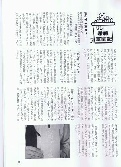 この法人化に間に合わせるかのように、当協会の多くの会員から中途失聴難聴者ならではの悩みや思いなどを寄せられた冊子「ほちょうきとりて」を発行した。6年ほど前に会員だったご遺族よりご寄附を頂いたことから、冊子を作ることに決まる。だが、肝心の内容が進まず、苦悩しながらも完成まで5年の歳月が流れた。この冊子は、中途失聴難聴のことを簡単に、読みやすく、判りやすく、一気に読めるように工夫してある。これにも「悩むな工夫せよ」があるような気がした。冊子の制作に尽力した一人は協会設立する時に喧嘩した仲間であり、制作に関わりった時には大変な苦労をされたと思う。やはり、中途失聴難聴者の福祉向上の目的は同じだと感じた。発行後は大変な好評を頂き、在庫が少なくなっているが、希望があれば当協会のホームページから申込ができます。個人的ながら、この冊子には「悩むな工夫せよ」のヒントがあると思っている。