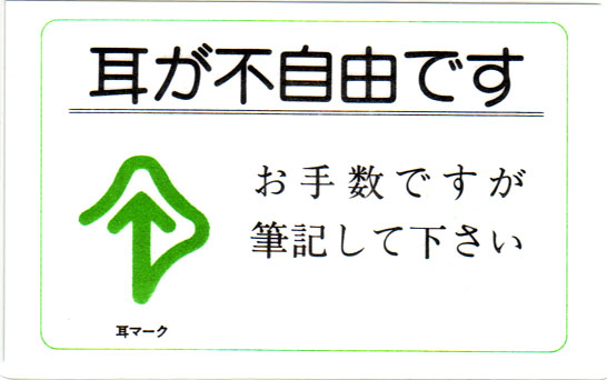 以下、松本理事長の体験談です。 ************************************* 平成22年11月3日、仙台市内の主な新聞社(読売・朝日・毎日・産経の順に。河北は既に依頼済み。)を訪問し、11月27日に開催される「人工内耳の説明と相談の会」(http://www.normanet.ne.jp/~miyanan/b/10102901.htm)の広報を依頼しました。 そこで難聴のため不便な体験をしました。それは休日に訪問したため社員が少なくなったせいか、カメラモニター付のインターホンで用件を言わなければならなかったことです。 カメラの前で用件を話すも、これに対し社員の方が話す内容が、サッパリ、聴き取れず、コミュニケーションが出来ず、往生してしまいました。 新聞社にしてみれば、休日のカメラモニター付のインターホンでの応対は、防犯上必要なことです。しかし、耳の不自由な者が訪問した場合の配慮は全くありませんでした。 そこで、私は、たまたま、耳マークカード(縦5.5cm×横8.5cm、画像の一枚目は表で2枚目が裏になってる。)持っていたことを思い出し、)これをカメラモニターに映しました。するとようやく社員の方も、難聴者と気付いて、出て来てくれました。そして、大変、親切に対応していただき、有り難く思いました。 ![]() この耳マークカードはJRみどりの窓口や宮城交通高速バスセンター、病院、薬局等には対面で役立つことは判っていましたが、カメラモニター付のインターホンでの応対でも、これを映すと役に立つことが判りました。 このような利用方法もありますので、ご参考にして下さい。 |