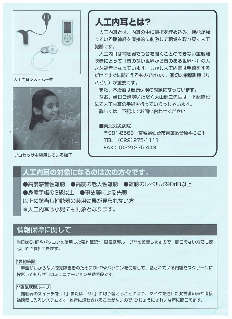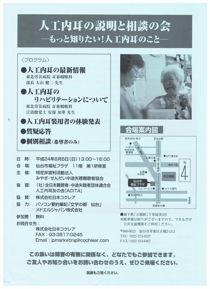 補聴器で効果の得られない高度難聴者のための 「人工内耳の説明と相談の会」 ―もっと知りたい!人工内耳のこと― 日 時: 平成24年8月5日(日)13:00~16:00 会 場: 仙台市福祉プラザ 11階 第1研修室 主 催: 特定非営利活動法人みやぎ・せんだい中途失聴難聴者協会 後 援: (社)全日本難聴者・中途失聴者団体連合会 人工内耳友の会[ACITA] 協 賛: 株式会社日本コクレア 協 力: パソコン要約筆記「文字の都 仙台」 メドエルジャパン株式会社 参加費: 無料 お問合せ先: 株式会社日本コクレア FAX:03-3817-0245?? Email:jpmarketing@cochlear.com 〈プログラム〉 ●人工内耳の最新情報 東北労災病院 耳鼻咽喉科 部長 大山 健二 先生 ●人工内耳のリハビリテーションについて 東北労災病院 耳鼻咽喉科 言語聴覚士 安部 知華 先生 ●人工内耳装用者の体験発表 ●質疑応答 ●個別相談(希望者のみ) 会場案内図 この集いは障害の有無に関係なく、どなたでもご参加できます。 ご友人やお知り合いをお誘い合わせのうえ、ぜひご来場ください。 ![]() ![]() |