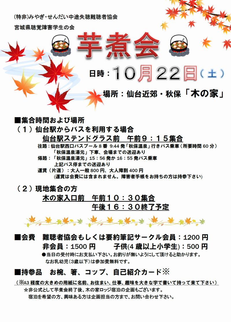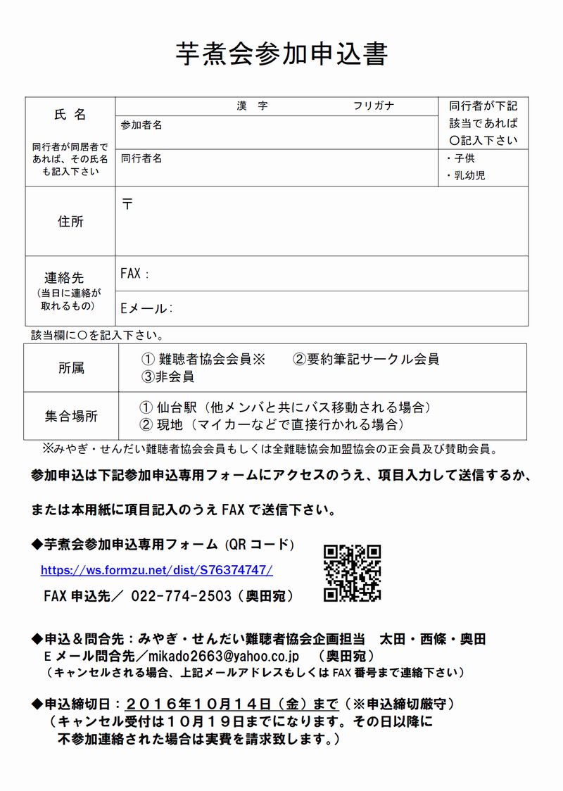 ○平成28年度芋煮会を以下の要領で開催します。 参加申込は下記参加申込専用フォームにアクセスのうえ、項目入力して送信するか、または本用紙に項目記入のうえFA X で送信下さい。 ◆芋煮会参加申込専用フォーム https://ws.formzu.net/dist/S76374747/ FA X 申込先022-774-2503(奥田宛) ![]()