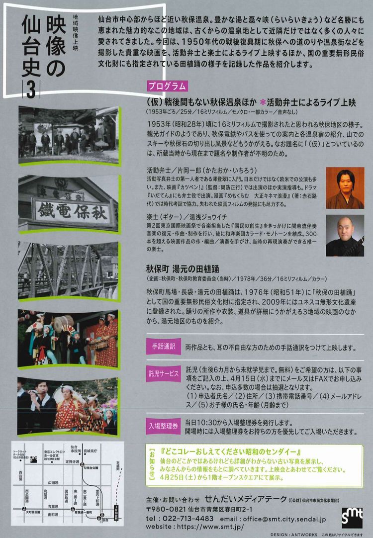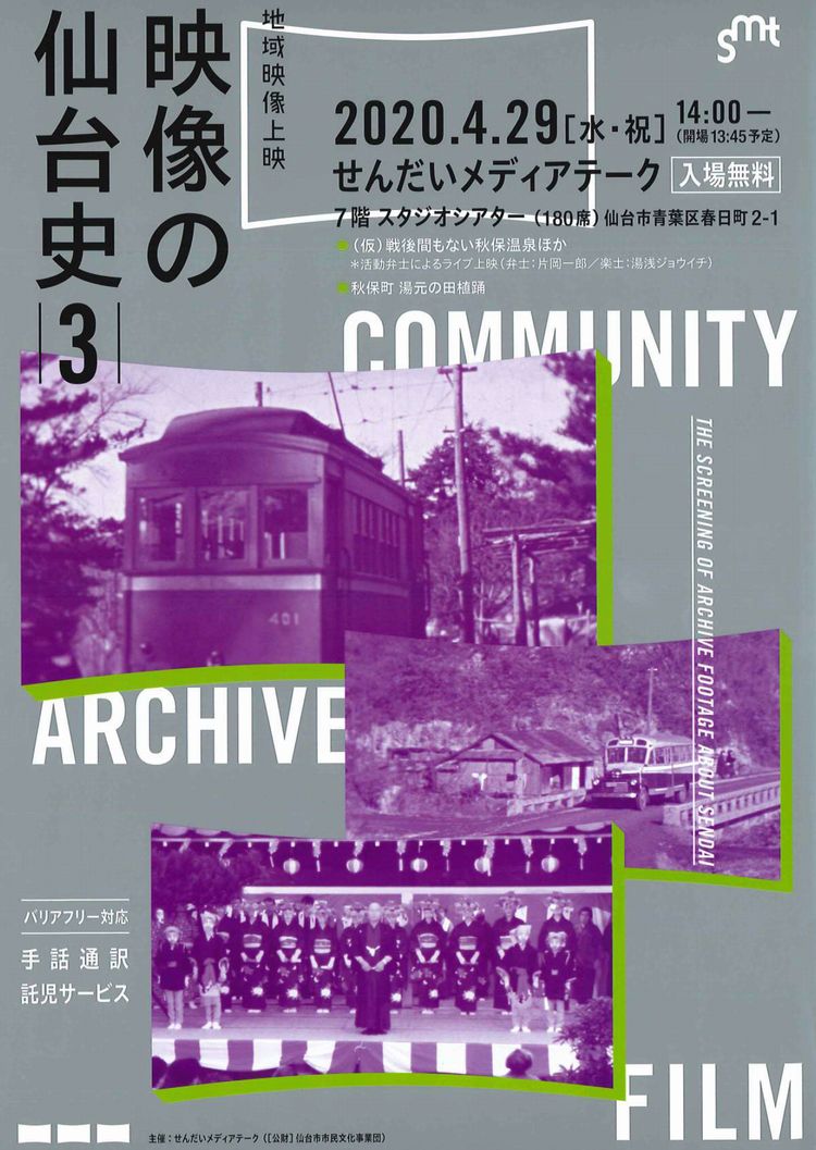 【イベント名】映像の仙台史3 【内容】仙台市中心部からほど近い秋保温泉。豊かな湯と磊々峡(らいらいきょう)など名勝にも恵まれた魅力的なこの地域は、古くからの温泉地として近隣だけではなく多くの人々に愛されてきました。今回は、1950年代の戦後復興期に秋保への道のりや温泉街などを撮影した貴重な映画を、活動弁士と楽士によるライブ上映するほか、国の重要無形民俗文化財にも指定されている田植踊の様子を記録した作品を紹介します。 【日時】2020年4月29日(水祝)14:00 (開場13:45予定) 【会場】せんだいメディアテーク 7階 スタジオシアター(180席) 【入場】無料(当日10:30から入場整理券を発行) 【バリアフリー対応】 ・手話通訳:両作品とも手話通訳をつけて上映します ・託児サービス:託児(生後6カ月から未就学児まで・無料)をご希望のかたは、以下の事項をご記入の上、4月15日(水)までにメール又はFAXでお申し込みください。 なお、申込多数の場合は抽選となります。①申込者氏名②住所③携帯電話番号④メールアドレス⑤お子様の氏名・年齢(月齢)まで 「※新型コロナウイルス感染拡大防止のため開催中止または延期する場合は、せんだいメディアテークのウェブサイトでお知らせします。」 【主催・問い合わせ】せんだいメディアテーク([公財]仙台市市民文化事業団) 〒980-0821 仙台市青葉区春日町2-1 fax : 022-713-4482 email : office@smt.city.sendai.jp 【URL】https://www.smt.jp/projects/toplus/2020/02/-3.html ![]() ![]() |