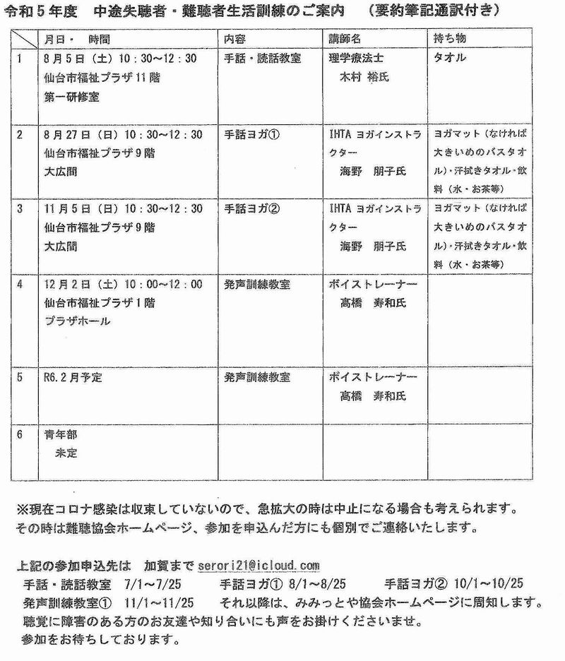 令和5年度仙台市障害者社会参加推進事業「中途失聴者・難聴者の方の生活訓練(要約筆記通訳つき)」のご案内です。